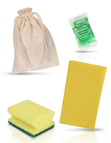 Inhalt: Die Bestellung umfasst 50 Bio Reinigungssets. Jede Packung enthält: 1 gelben Putzlappen, 1 gelben Putzschwamm, 1 Flasche Bio Geschirrspülmittel 30ml, 1 Bio Handseife 10gr & 1 Mülltüte.