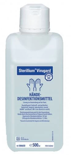 Bode Sterillium Virugard Händedesinfektionsmittel Hochwirksames viruzides Händedesinfektionsmittel. besonders wirksam gegen gehüllte und unbehüllte Viren viruzid (HBV, HIV, BVDV*, Adeno-, Herpes-, Papova-, Polio-, Rota-,Vacciniaviren) empfohlen vom Robert-Koch-Institut bei Noroviren farbstoff- und parfümfrei zum Einreiben speziell für Arbeitsbereiche mit erhöhter Infektionsgefährdung kurze Einwirkzeit trocknet schnell und rückstandsfrei RKI zertifiziert Lieferumfang: 1 Flasche mit 100 ml Produktkennzeichnung und Warnhinweise: GEFAHR Kennzeichnung(VERORDNUNG (EG) Nr. 1272/2008) Gefahrenhinweise:H225 Flüssigkeit und Dampf leicht entzündbar.H412 Schädlich für Wasserorganismen, mit langfristiger Wirkung. Sicherheitshinweise:P102 Darf nicht in die Hände von Kindern gelangen. Prävention:P210 Von Hitze/Funken/offener Flamme halten. Nicht rauchen.P233 Behälter dicht verschlossen halten.P273 Freisetzung in die Umwelt vermeiden. Reaktion:P305 + P351 + P338 BEI KONTAKT MIT DEN AUGEN: Einige Minuten lang behutsam mit Wasser spülen. Eventuell vorhandene Kontaktlinsen nach Möglichkeit entfernen. Weiter spülen.P337 + P313 Bei anhaltender Augenreizung: Ärztlichen Rat einho-len/ ärztliche Hilfe hinzuziehen.P370 + P378 Bei Brand: Trockensand, Trockenlöschmittel oder alkoholbeständigen Schaum zum Löschen verwenden. Entsorgung: P501 Inhalt/ Behälter einer anerkannten Abfallentsorgungsanlage zuführen.