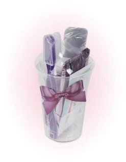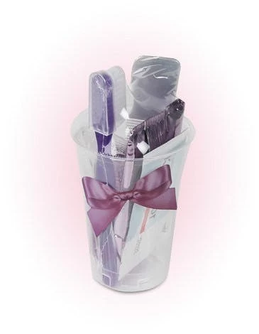 Hotelkosmetik im Becher, bestehend aus Zahnbürste, Zahnpasta, Handseife, Eau de Cologne und einem Kamm.