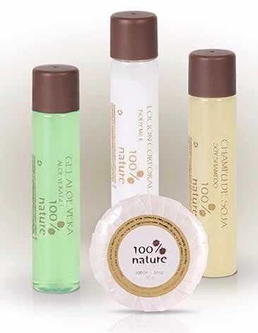 Musterset 100% Nature bestehend aus Duschgel, Shampoo und Body Lotion und einer Handseife.