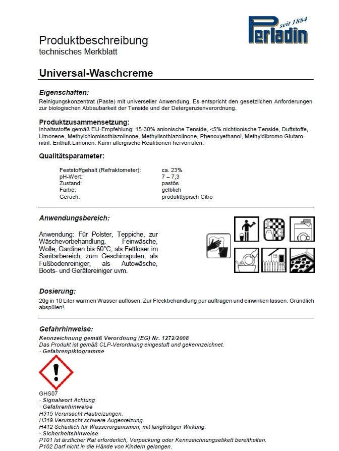 Original Perladin Reinigungsmittel seit 1884 – Universal WaschCreme-Konzentrat – Eimer mit Griff – Inhalt 1 Liter – Perladin Universalwaschcreme Konzentrat ist der ideale pastöse Reiniger für fast alle Anwendungsfälle in Haushalt und Gewerbe und besonders geeignet als: Neutralreiniger, Sanitärreiniger, Teppichreiniger, Polsterreiniger, Haushaltsreiniger, Auto-Wäsche, Vorwaschmittel, Textilreiniger, Bootsreiniger, Gerätereiniger. – Dosierung: je nach Wasserhärte ca. 5ml in 5 Liter Wasser lösen; (Wolle, Synthetics, Feinwäsche, Gardinen, Handwäsche, Kacheln, Fliesen, Waschbecken: 1 Eßlöffel auf 10 Liter Wasser; Kragen, Manschetten, Fleckbehandlung: pur auftragen; Arbeitskleidung: 2 Eßlöffel auf 10 Liter Wasser; Fenster, Rahmen, lackierte Möbel etc. 1 Teelöffel auf 5 Liter Wasser; Steinfußböden, Fußbodenbeläge -wie PVC, Linoleum, Laminat, Parkett-: 1-2 Eßlöffel auf 10 Liter Wasser; Autowäsche: 1 Eßlöffel auf 10 Liter Wasser; Geschirrspülen: 1 Teelöffel auf 5-10 Liter Wasser)