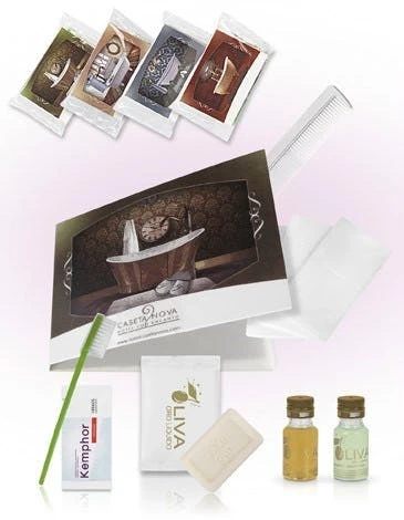 Set 2 Vintage Badewanne, bestehend aus: Zahnbürste, Zahnpasta im Sachet, Eau de Cologne, 2x Duschgel und Shampoo 2in1 15ml., Kamm, Handseife, Duschhaube und Taschenücher. 4 verschiedene Badewannen-Motive (gemischt).
